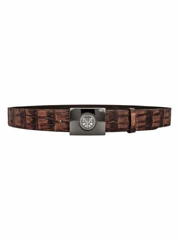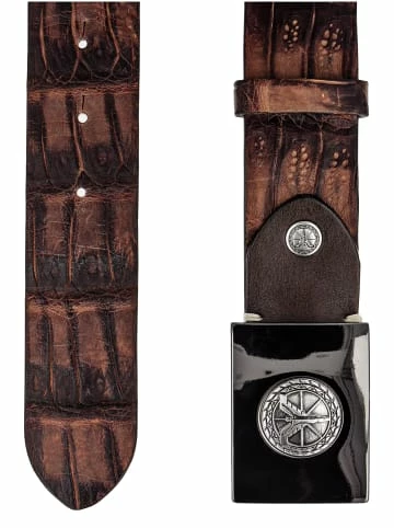 Gürtelbreite: 4,0 cm2-farbige Koppelschließe mit Logo PrägungGefüttert mit VollrindlederSattlerhandnaht an der SchließeEchte Kaimanhaut mit charakteristischer Narbung – Gürtelbreite: 4,0 cm – 2-farbige Koppelschließe mit Logo Prägung – Gefüttert mit Vollrindleder – Sattlerhandnaht an der Schließe – Echte Kaimanhaut mit charakteristischer Narbung
